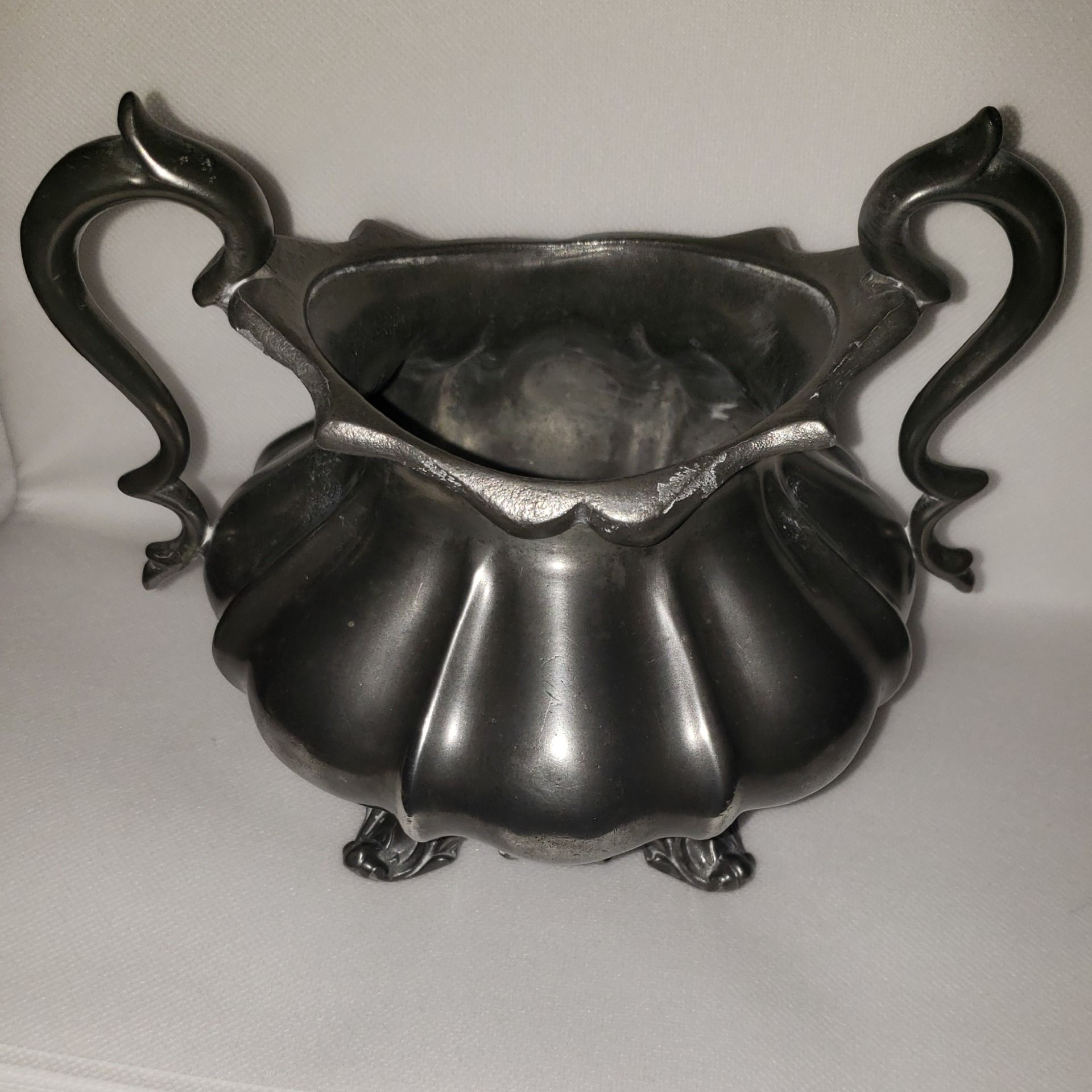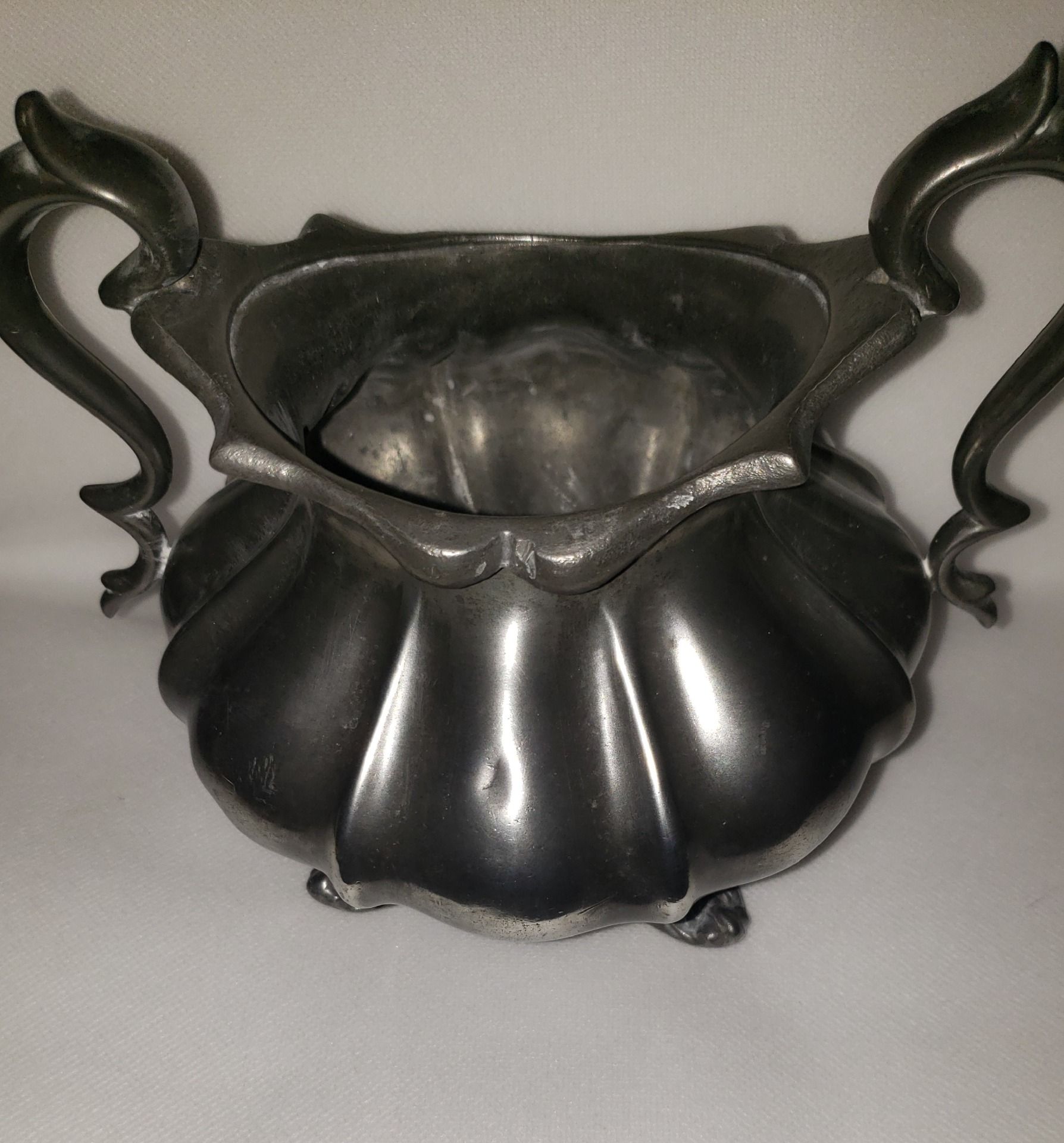 Patine naturelle, belle brillance de l’étain , anses complètes et solides, pas de rupture ou soudure ni de fissure structurelle, quelques traces mineures dues à l’âge, léger enfoncement discret sur le corps.