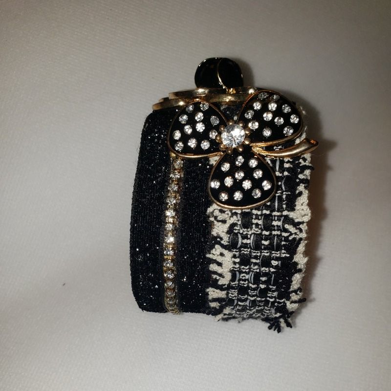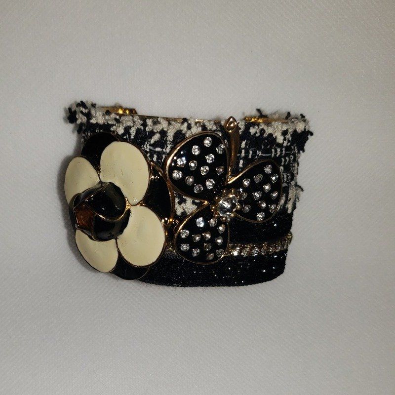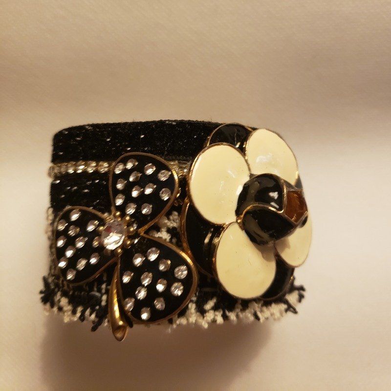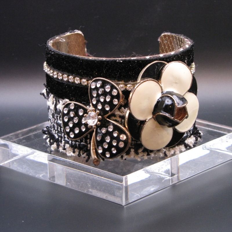 Couleurs et matériaux: Tweed et velours noir et blanc, strass - fleurs en émail et strass