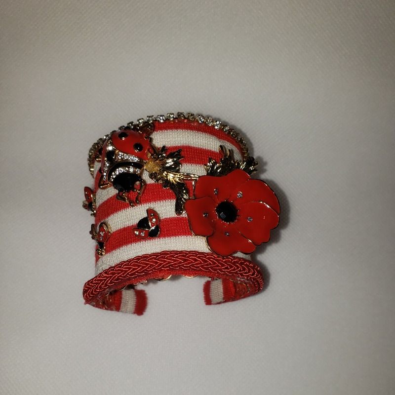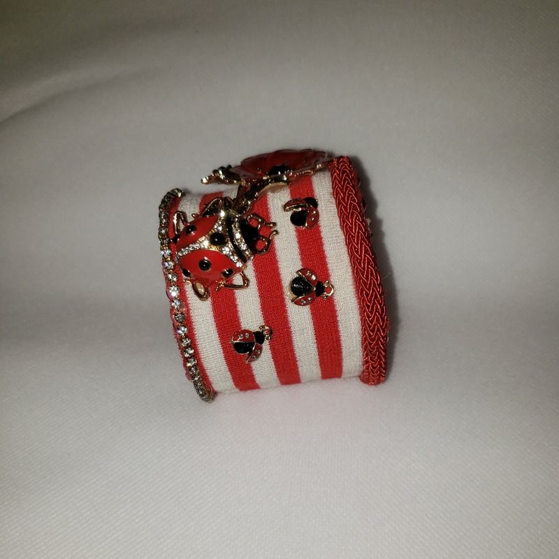 Couleur et matériaux: Tissus maille à rayures blanches et rouges, bordures en galon et strass, breloques en émail et strass