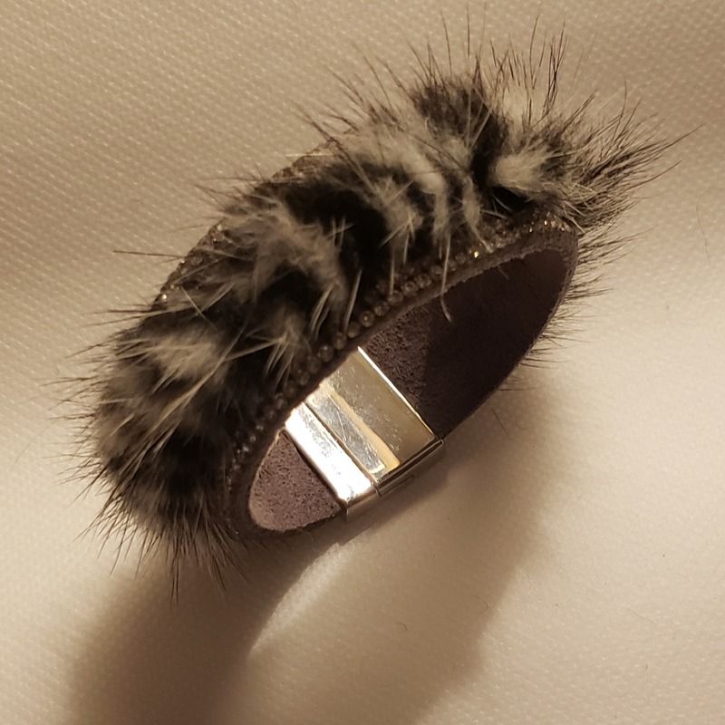 Amusant bracelet - Fourrure rayée et ruban strassée - Fermeture magnétique- Dimensions: diamètre 21cm
