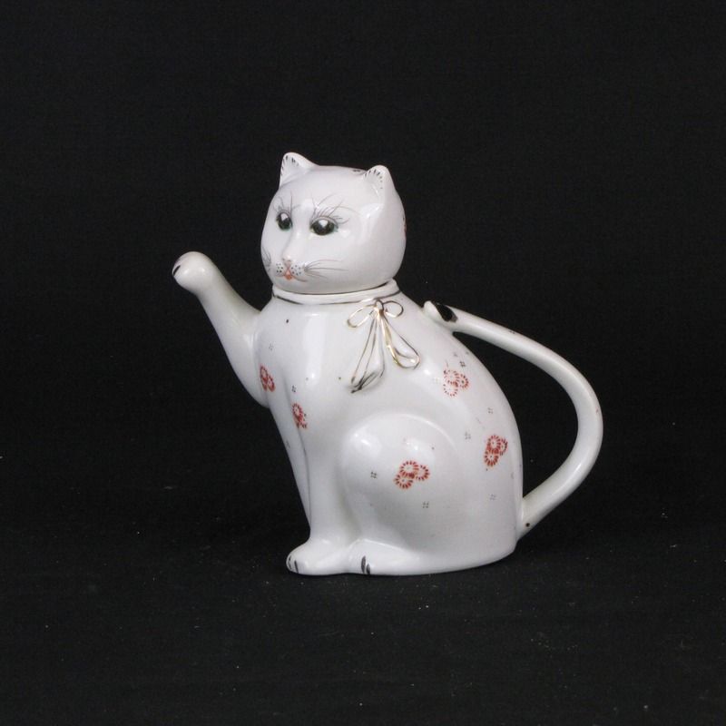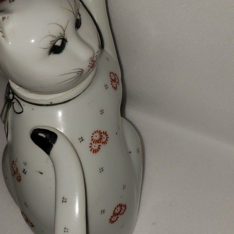 Charmante théière ancienne en forme de chat, représentant un chat assis.
