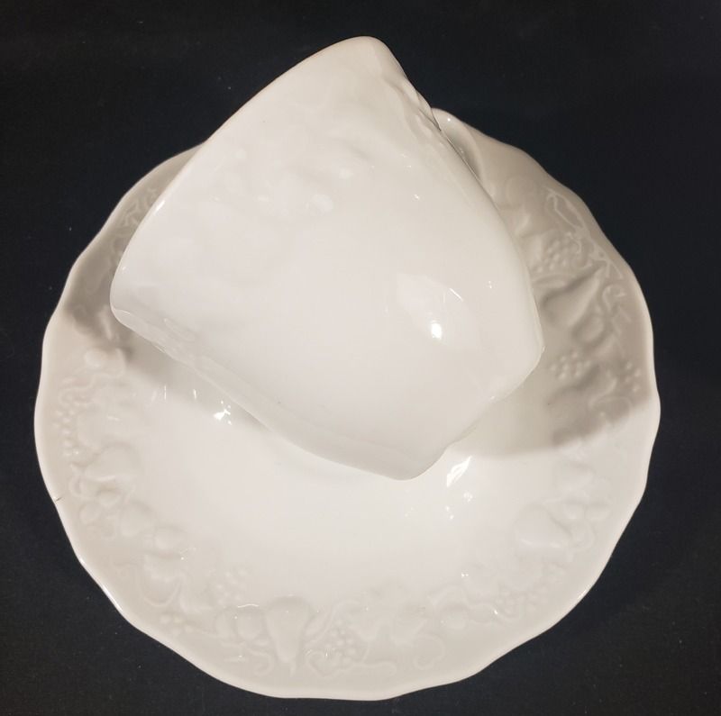 Chaque pièce présente un léger décor en relief autour du bord rappelant les modèles classiques de porcelaine de Bavière ou de Limoges.
