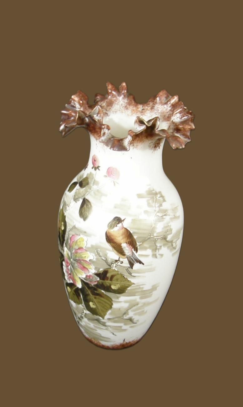 Élégant vase en verre opalin soufflé, époque Napoléon III, orné d’un raffiné décor animalier et poétique peint à la main.