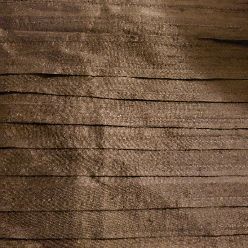 Tout le centre de la longueur est plissé de petits plis plats resserrant l’amplitude du tissus, ses extrémités évasées gardent au contraire l’ampleur de la soie permettant de la nouer pour un maintien stylé.