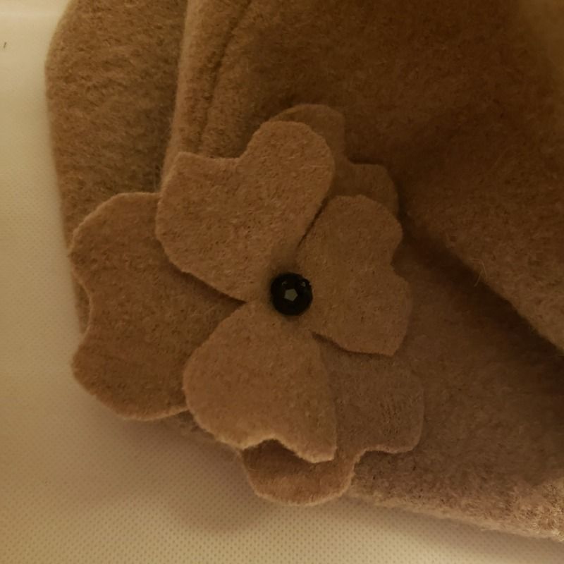 Le chapeau, décoré d’une fleur textile faite main et cousue, apporte une touche féminine et raffinée.