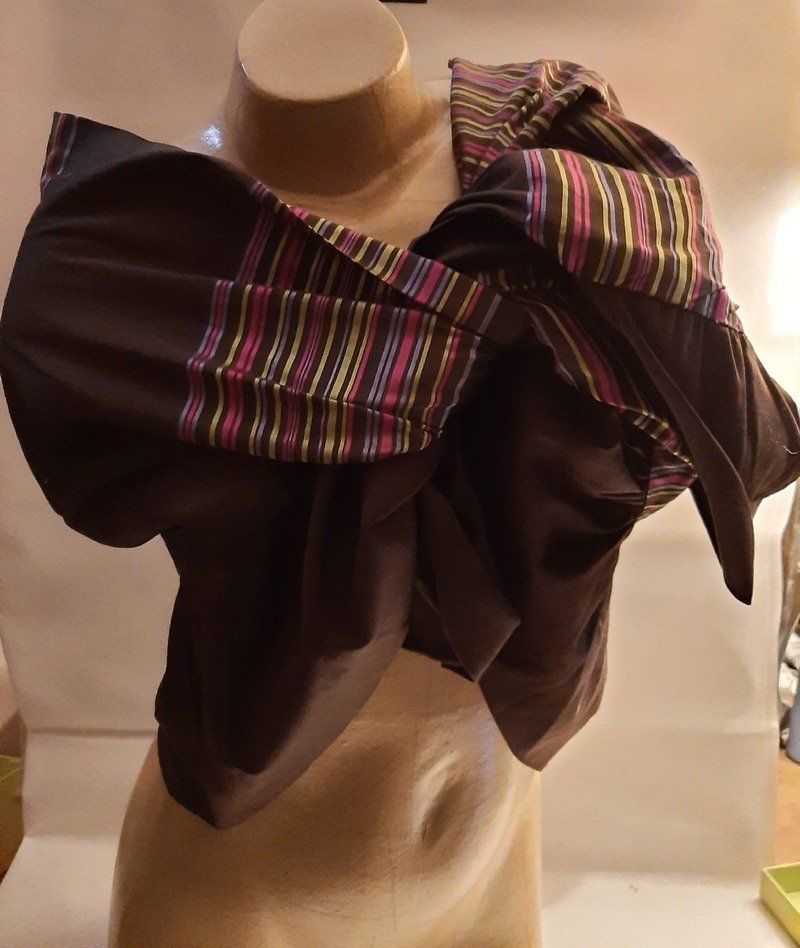 Grande étole volantée en soie sauvage - brun chocolat + rayures colorées - Pièce unique -