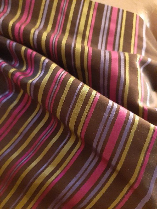 La base est brun profond, rehaussée d’une large bande rayée dans des tons vifs : rose, violet, jaune.