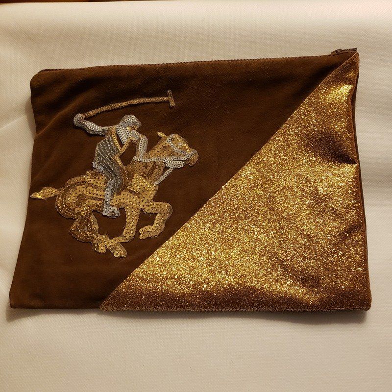 Elle est en cuir véritable recto, verso avec un triangle sur le devant en tissus lurex épais et une apposition pailletée d'un personnage représentant un joueur de polo sur son cheval.