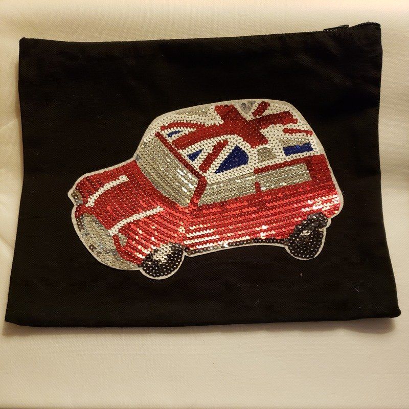 Sur le devant une voiture pailletée au toit aux couleurs de l'Union Jack est apposée.