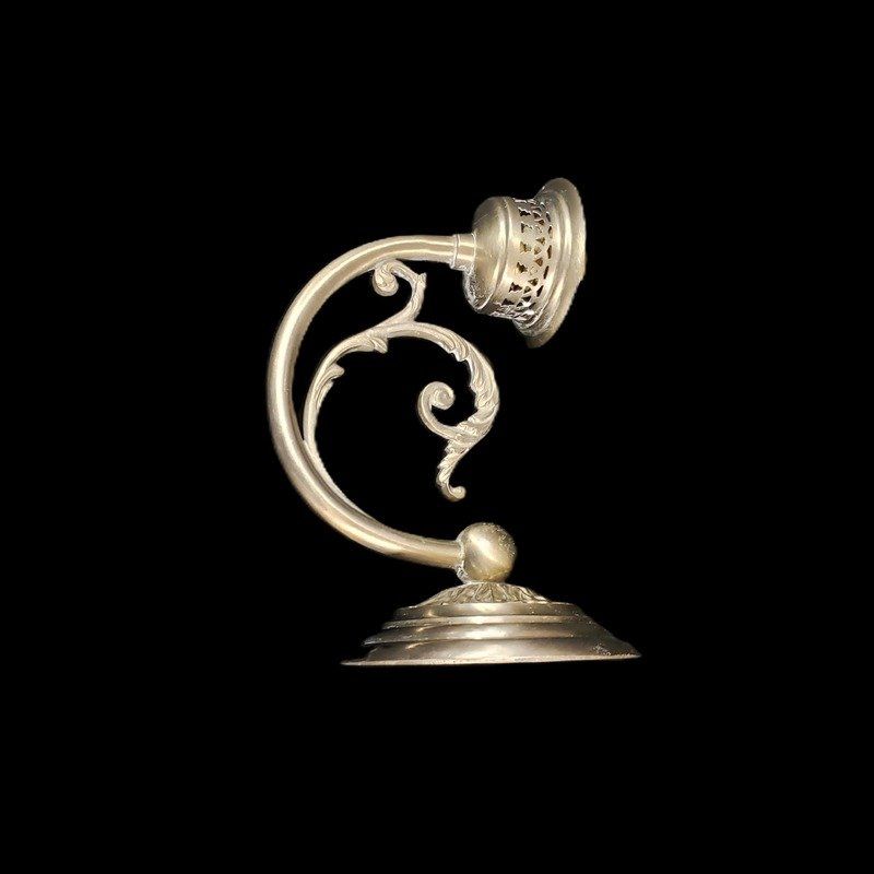 Élégante lampe ou applique ancienne en laiton nickelé, au joli ton argenté finement travaillé, au décor de volutes et feuillages.