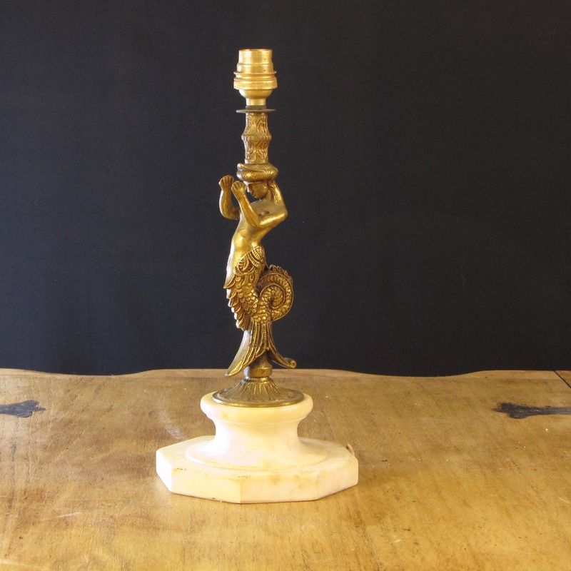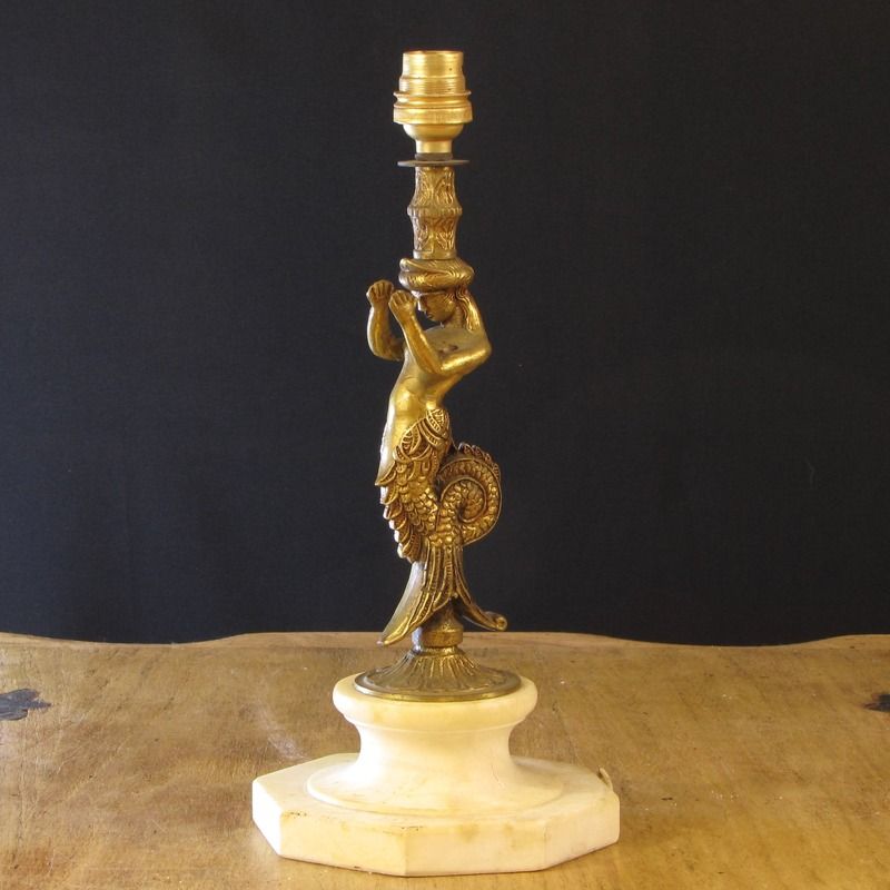 Pied de lampe ancien en bronze doré et base en marbre – motif femme poisson stylisé