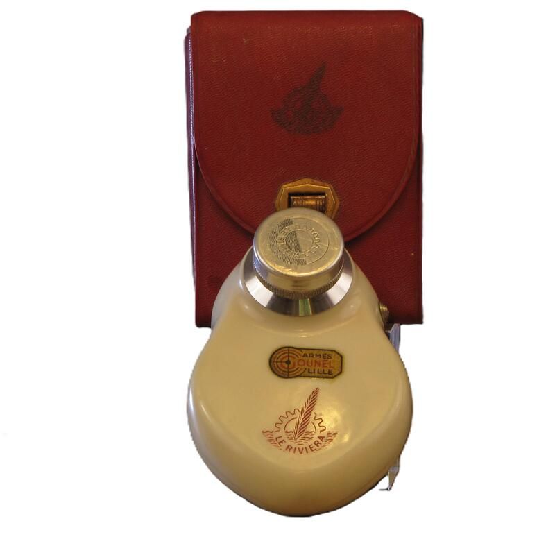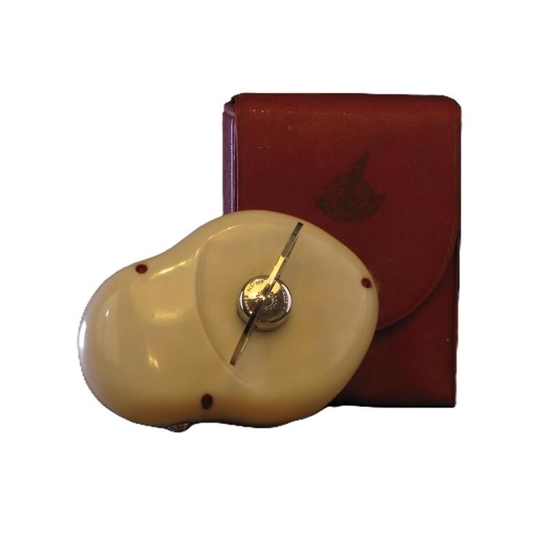 en bakélite et aluminium fourni avec son étui rouge d’origine. Particularité : remontage mécanique par clé papillon à l’arrière