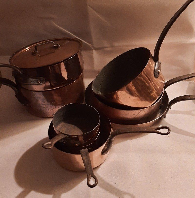 Série de casseroles fin 19ème en cuivre – 8 pièces + couvercle assorti