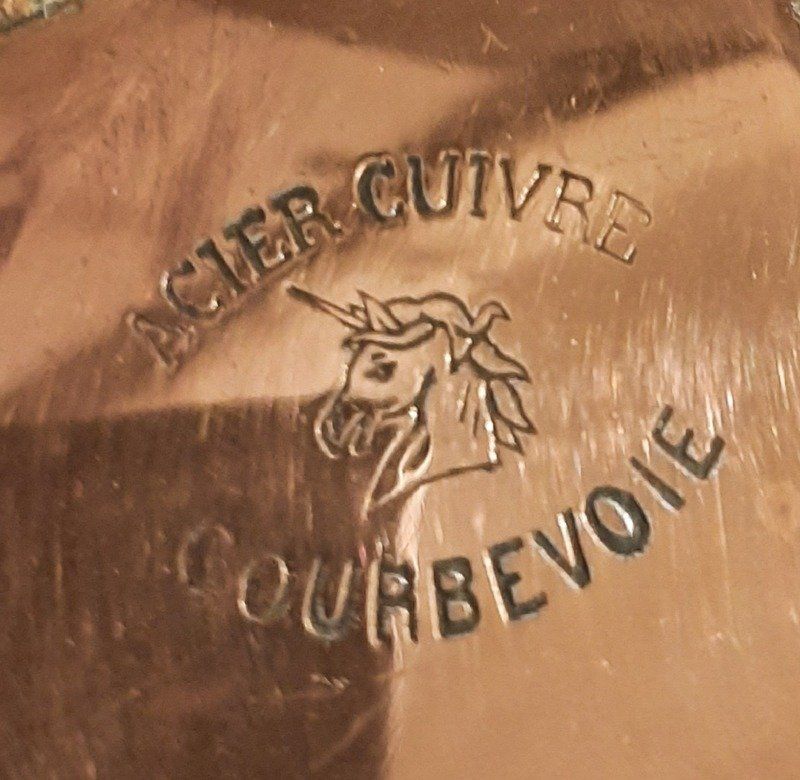 Courbevoie était un haut lieu de la métallurgie culinaire française et cette marque était réputée pour la qualité de ses ustensiles professionnels. L’ emblème de licorne correspond à une fabrication française ancienne.