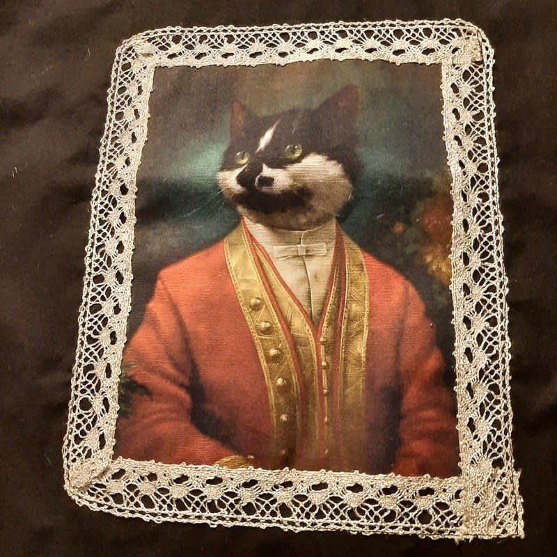 En coton de couleur noir. Bande de dentelle appliquée comme un cadre autour de l'impression chat.