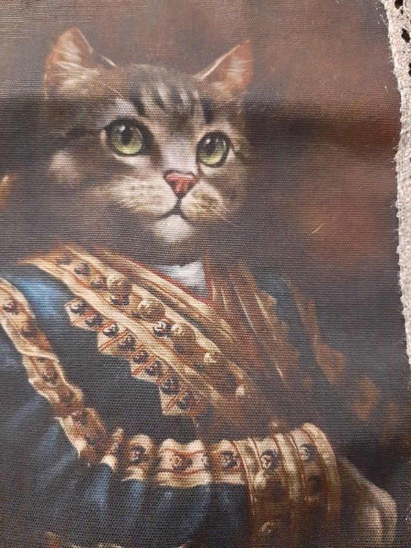 En coton de couleur noir. Bande de dentelle appliquée comme un cadre autour de l'impression chat.