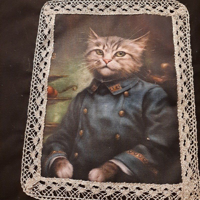 En coton de couleur noir. Bande de dentelle appliquée comme un cadre autour de l'impression chat.