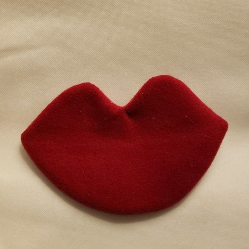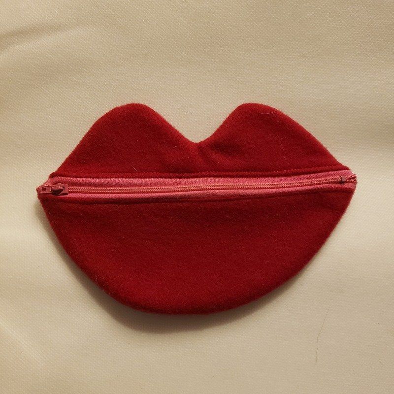 Petite trousse en forme de bouche réalisée en lainage de récupération.