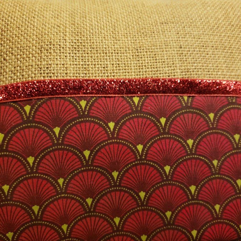 Elle est doublée, avec fermeture éclair et en bi-matière jute et coton imprimé. Un ruban pailleté apporte une note sophistiquée.