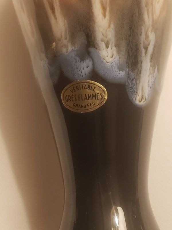 Étiquette d’origine « Grès Flammés – Fait Main ».